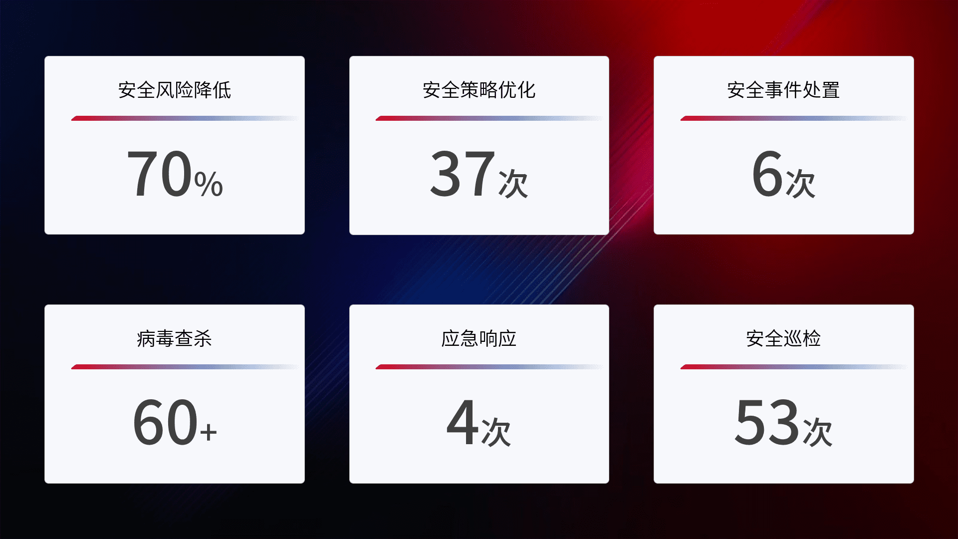 提供全面的安全事件报告体系,,,,包括处置报告、、、周报、、、、季度和年度总结,,,结合持续监控,,帮助客户深入了解网络安全状况。。