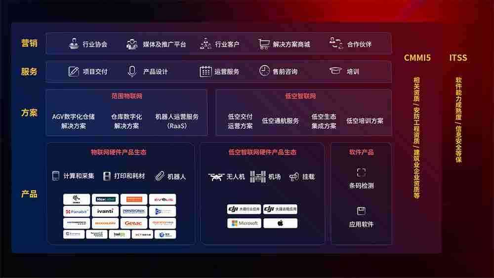 聚合国内外先进的物联网硬件产品品牌,,聚焦数字化仓储、、机器人运营、、、低空智联网等领域,,共同打造适合客户业务场景的解决方案并提供交付服务