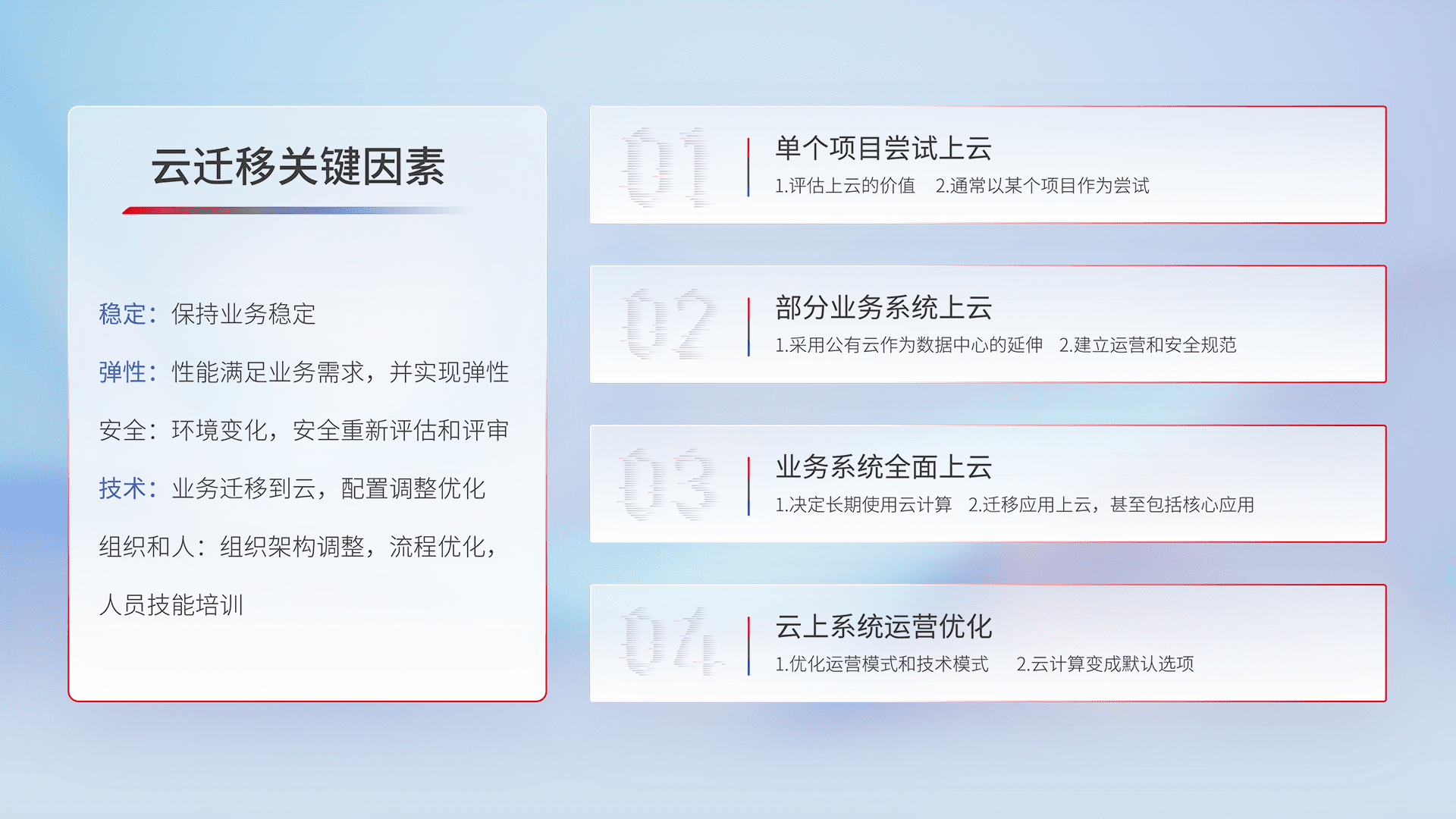 结合实际业务,,,,从规划设计、、、云平台选型、、云原生改造、、数据迁移、、、、集成交付,,迁移全过程为客户识别最佳上云路径,,,做好风险识别管理,,,,设计网络架构、、、身份权限、、安全审计合规、、操作审计、、、日志审计、、、、监控告警策略、、、、多站点容灾设计等,,,对云上基础设施进行整体规划,,,提升IT治理水平,,,,以满足弹性、、、、高可用、、、高性能的需求。。。