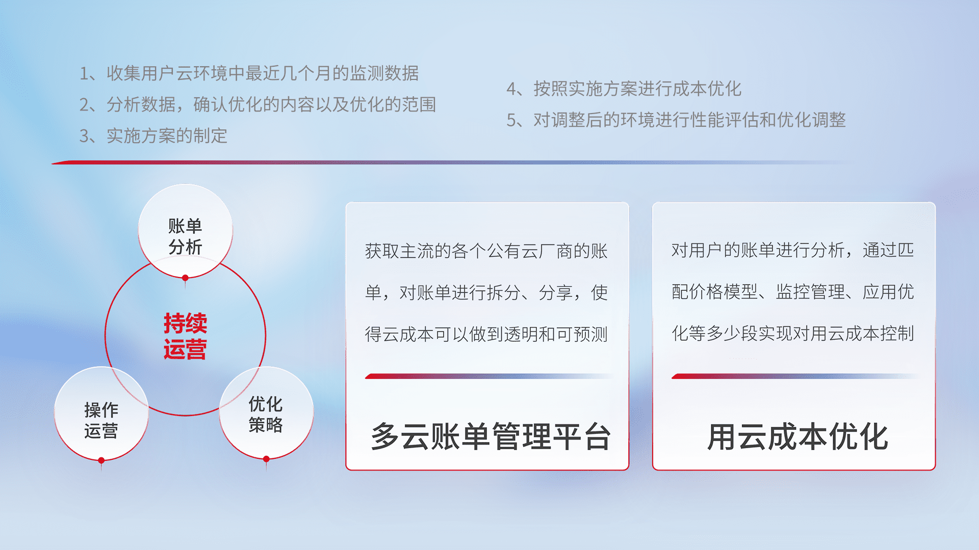 通过多云纳管,,,,以统一的资源数据模型把客户的云资源进行抽象和封装,,,,进而实现对多云资源的统一操作,,,,保障云资源管理的可靠性、、稳定性与可用性。。量身定制化运维内容,,,配置、、、、开发运维、、、、补丁管理、、备份、、监控、、、、认证和访问管理、、、、审计和日常巡检等,,,,保障在用云过程中的可靠度,,,稳定度以及高可用率。。