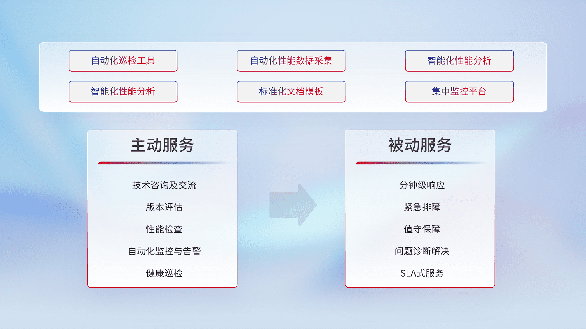 智能化工具和标准化文档,,,,保障服务质量,,提供主动服务(包含技术咨询、、、版本评估、、、性能检查、、、自动化监控与告警、、健康巡检)和被动服务包含(分钟级响应、、、紧急排障、、值守保障、、问题诊断解决、、SLA服务)。。。。